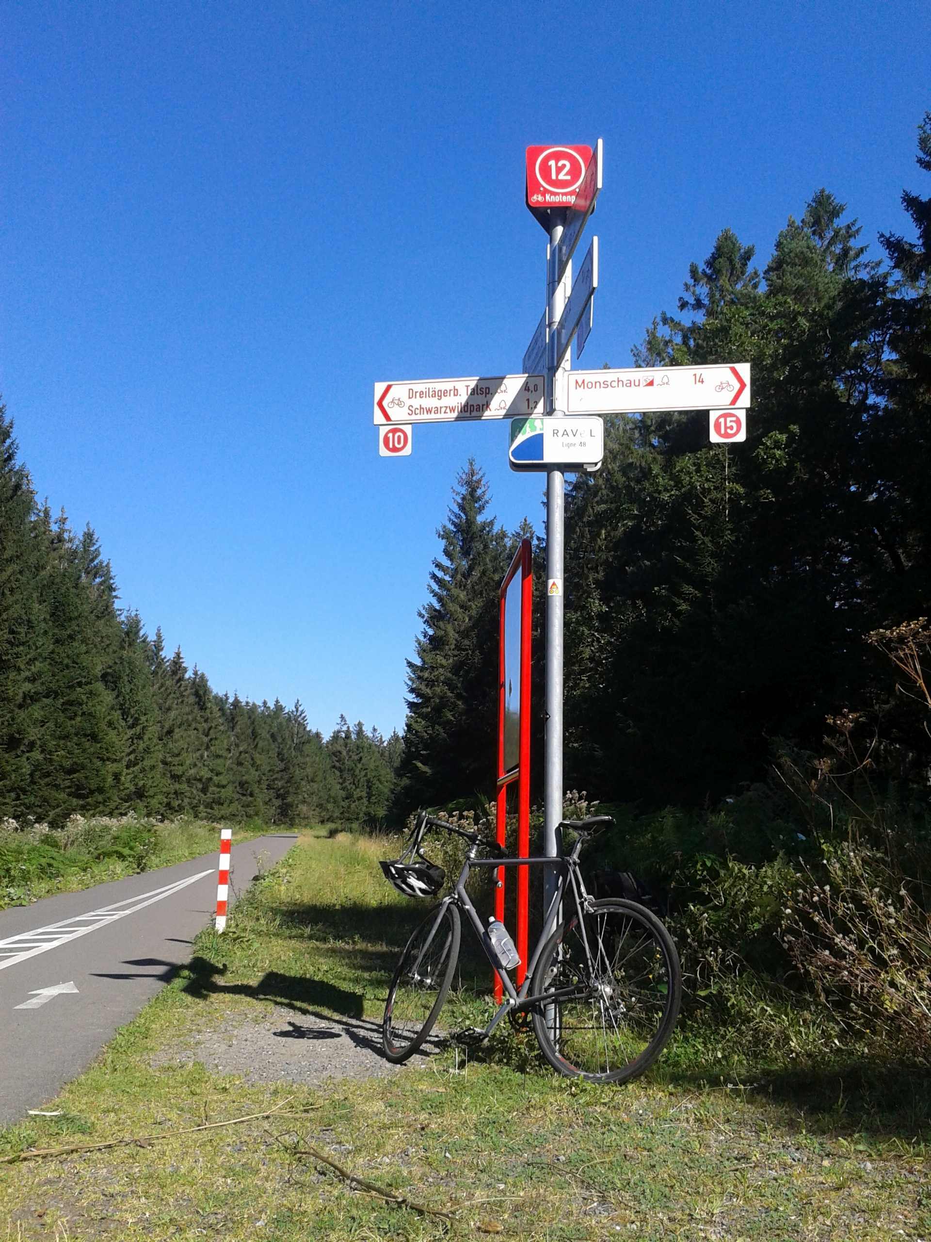 Der Weg zieht sich weiter leicht bergan, bei Bucholz KM 16,0 erreicht man die Wasserscheide Maas/Rhein auf in etwa 620m Höhe. DAS ist der höchste Punkt der Reise. Von nun an gehts bergab!